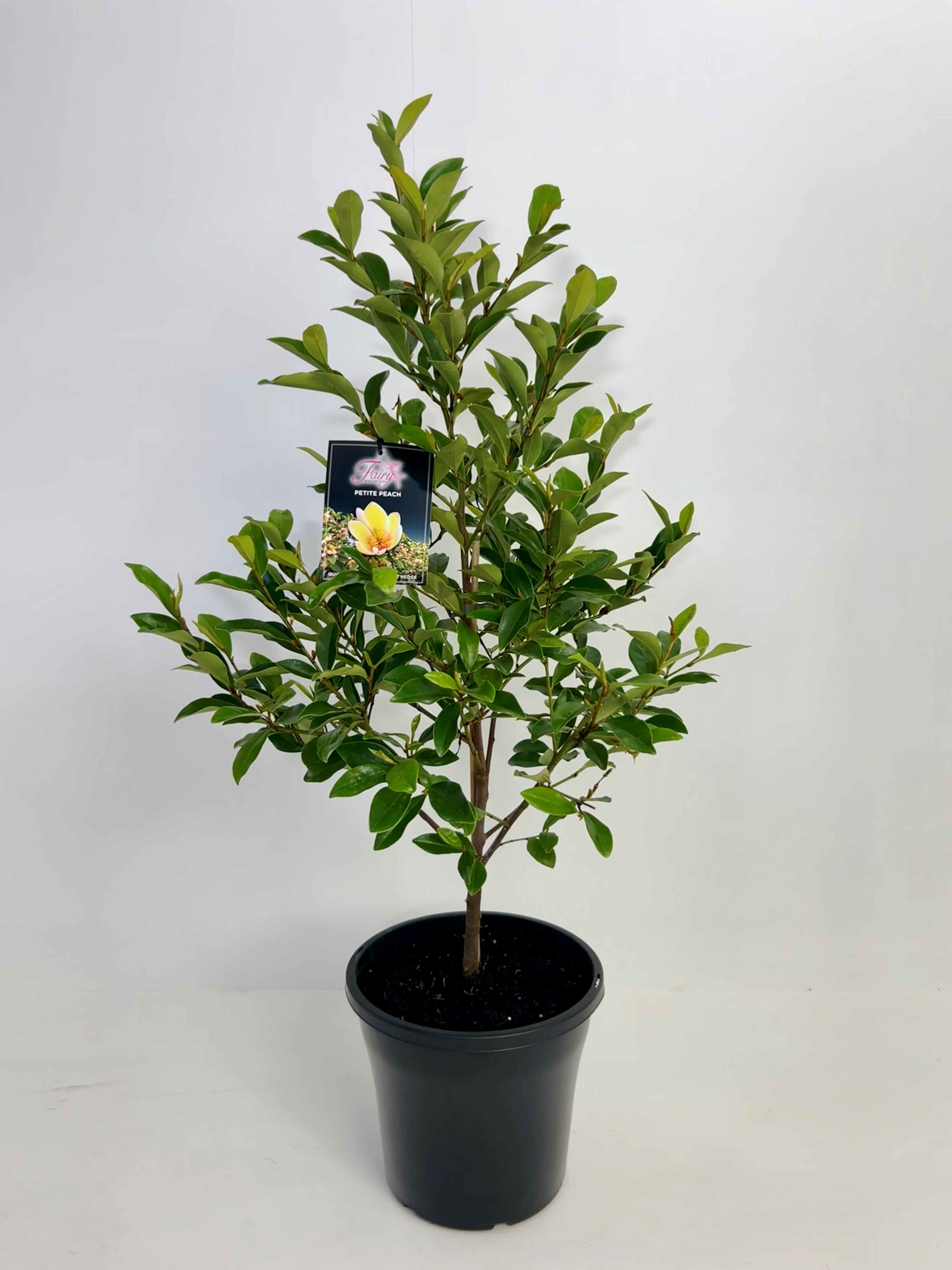 Fairy Petite Peach is a Magnolia hybrid bred by renowned New Zealand breeder Mark Jury, with beautiful soft peach flowers and evergreen foliage. Ideal as a specimen shrub, espalier, hedge or in a large planter. This variety is more compact than others in the Fairy Magnolia range. Prune to size after flowering in Spring.